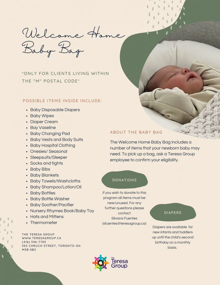 The Welcome Home Baby Bag program delivers a new baby bag, filled with baby clothes, a toy, a blanket, diapers and feeding bottles to new mothers while in the hospital or at home.