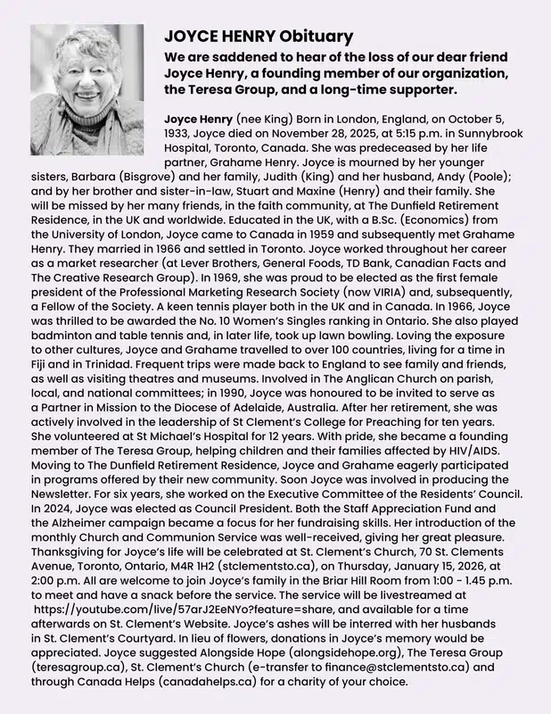 We are saddened to hear of the loss of our dear friend Joyce Henry, a founding member of our organization, the Teresa Group, and a long-time supporter.